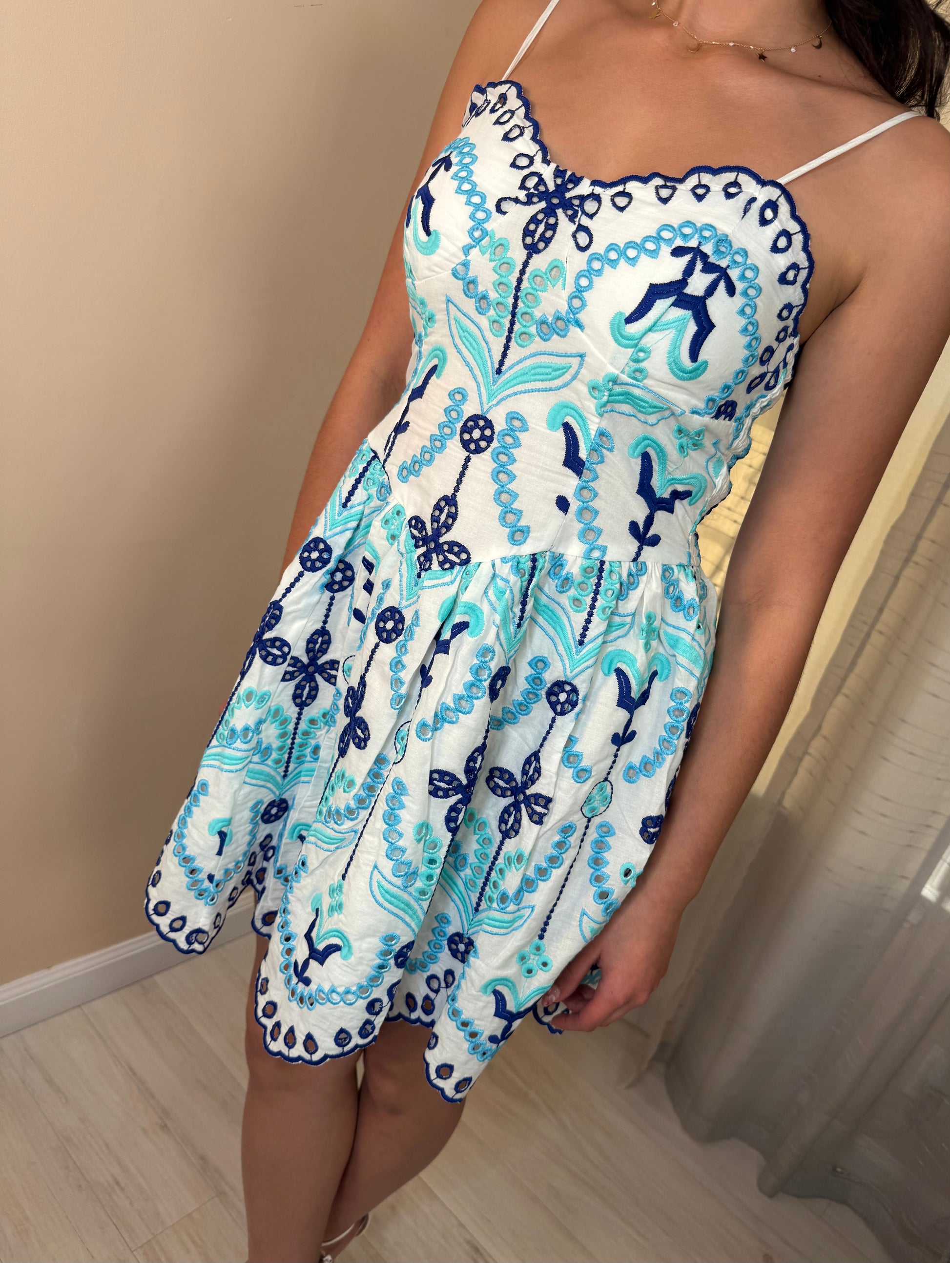CONTRASTING EYELET DRESS WITH SCALLOP HEM AND FULL