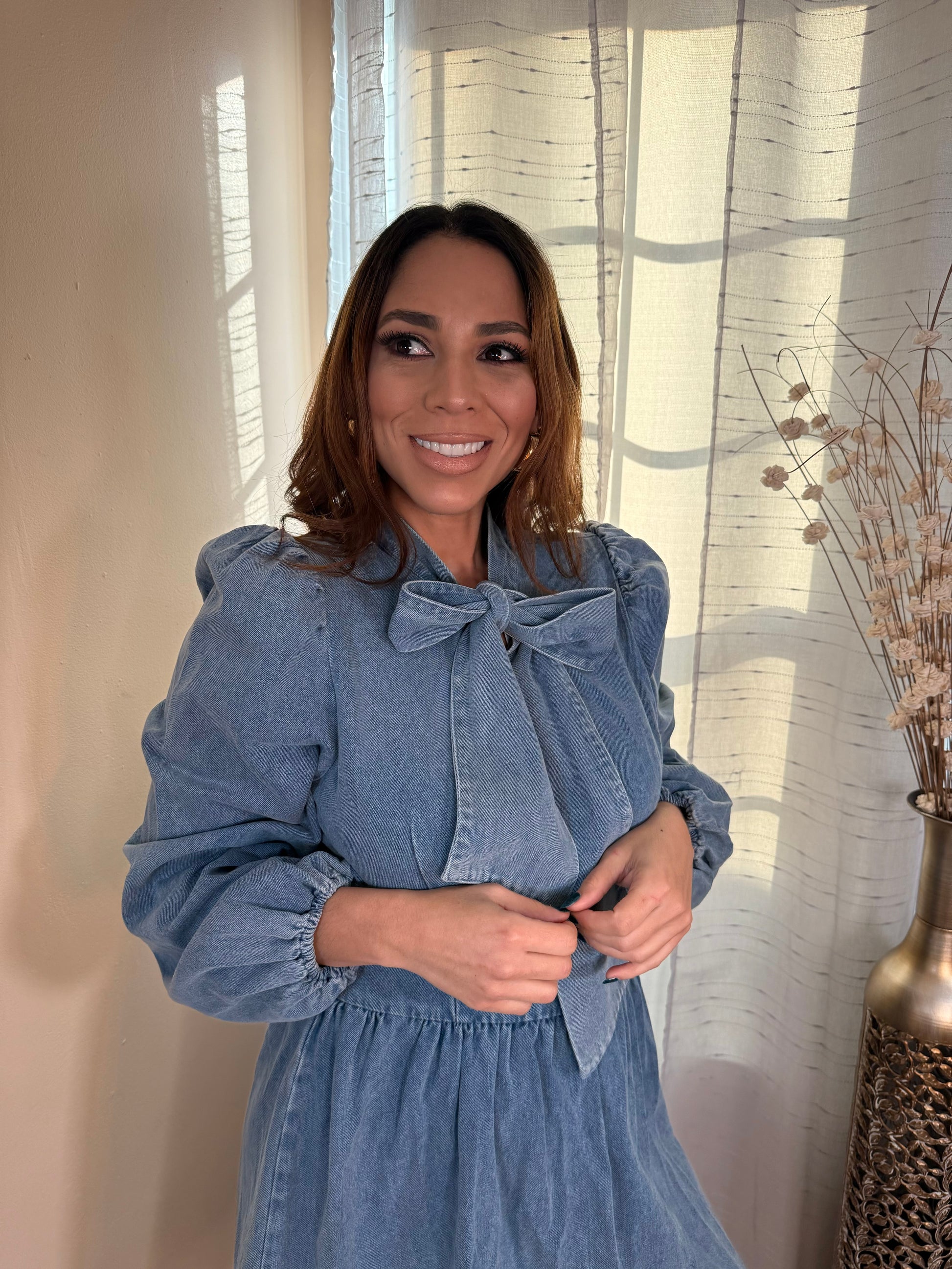 LONG SLEEVE DENIM DRESS WITH FRONT BOW NECK TIE