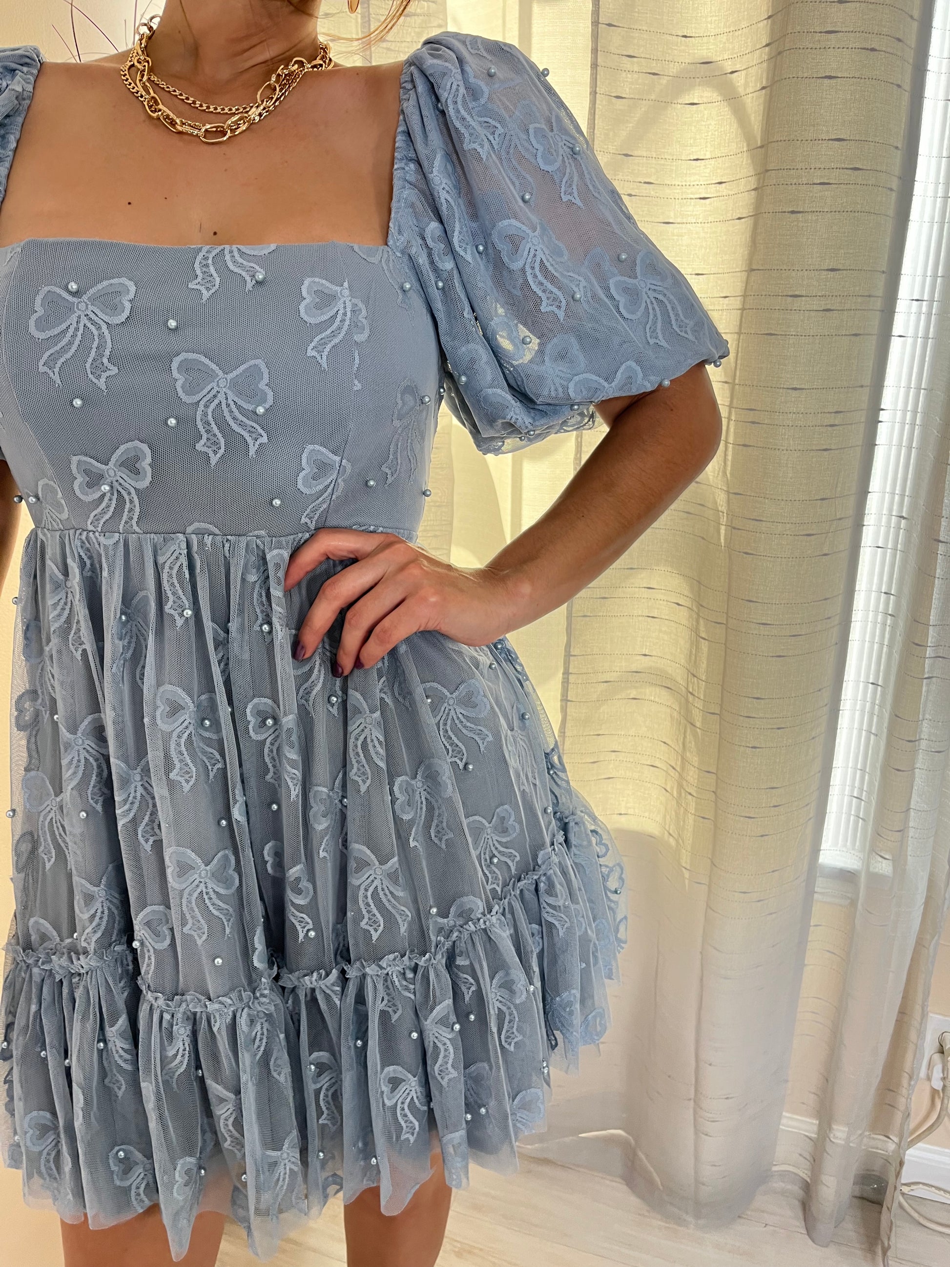 BOW JACQUARD MESH WITH PEARL DETAIL MINI DRESS