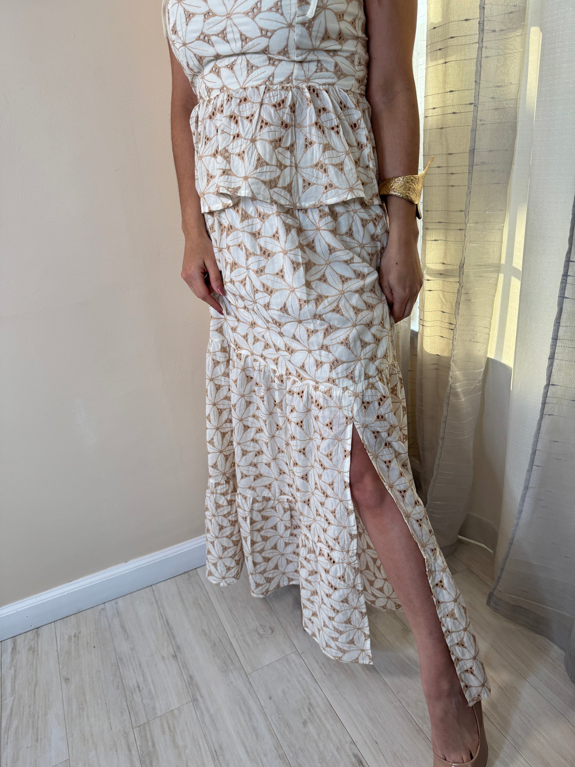 FLOWER EYELET SIDE SLIT MAXI SKIRT