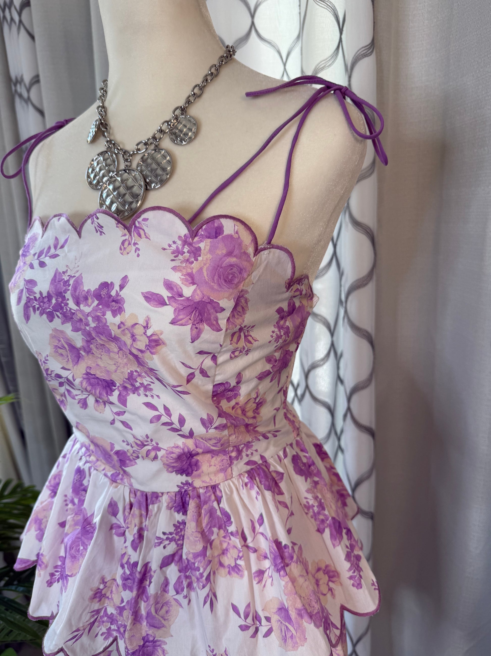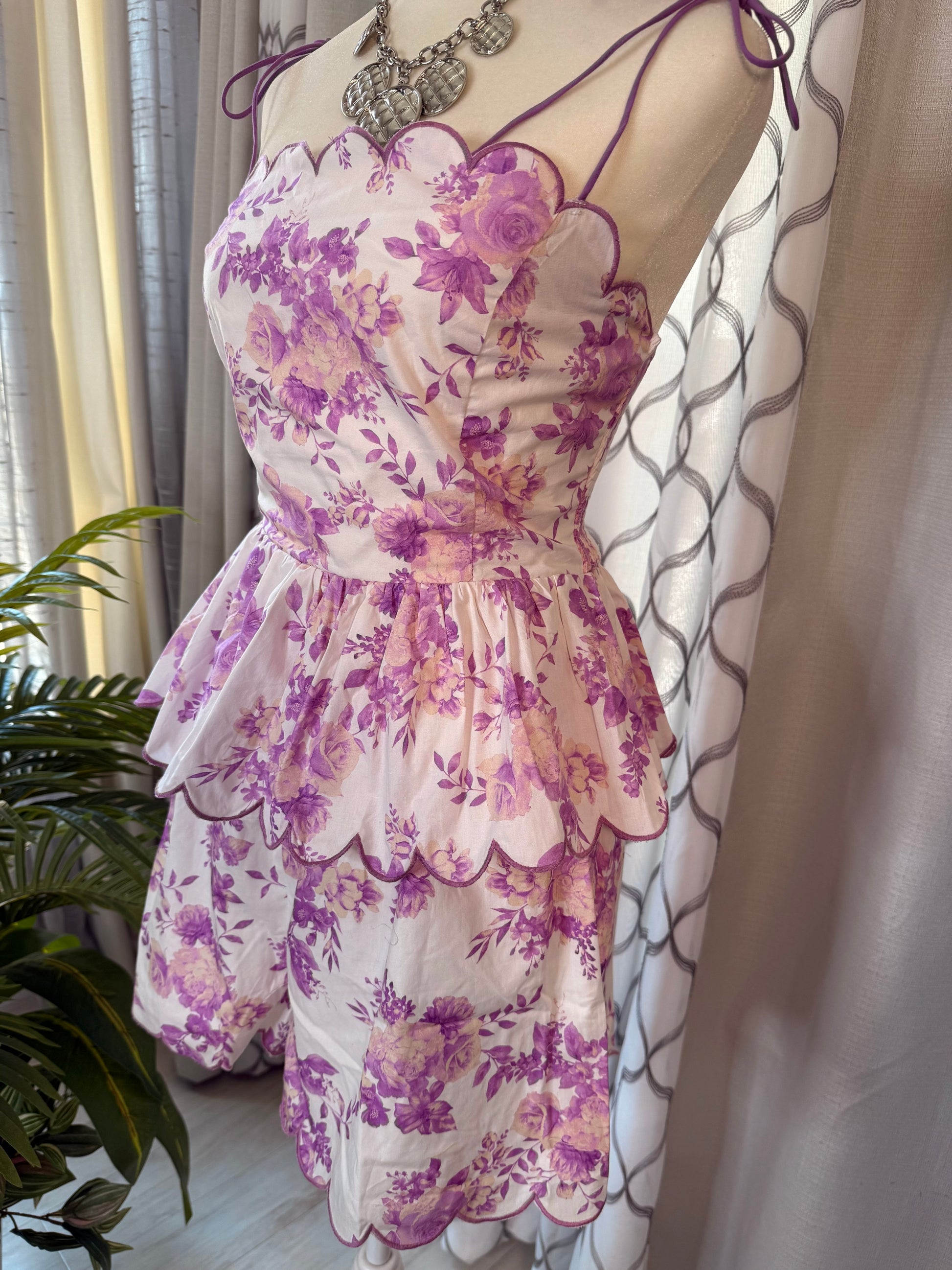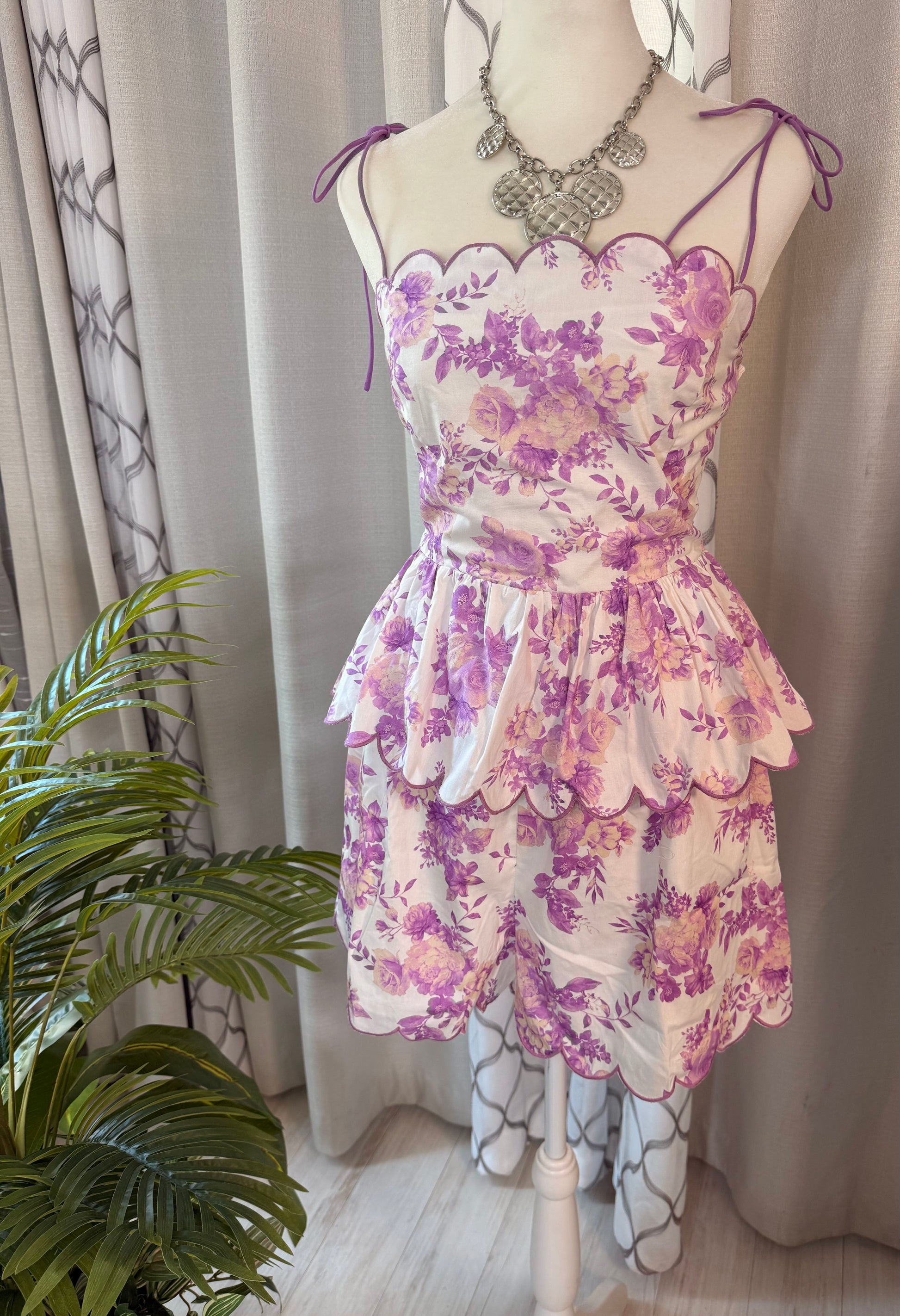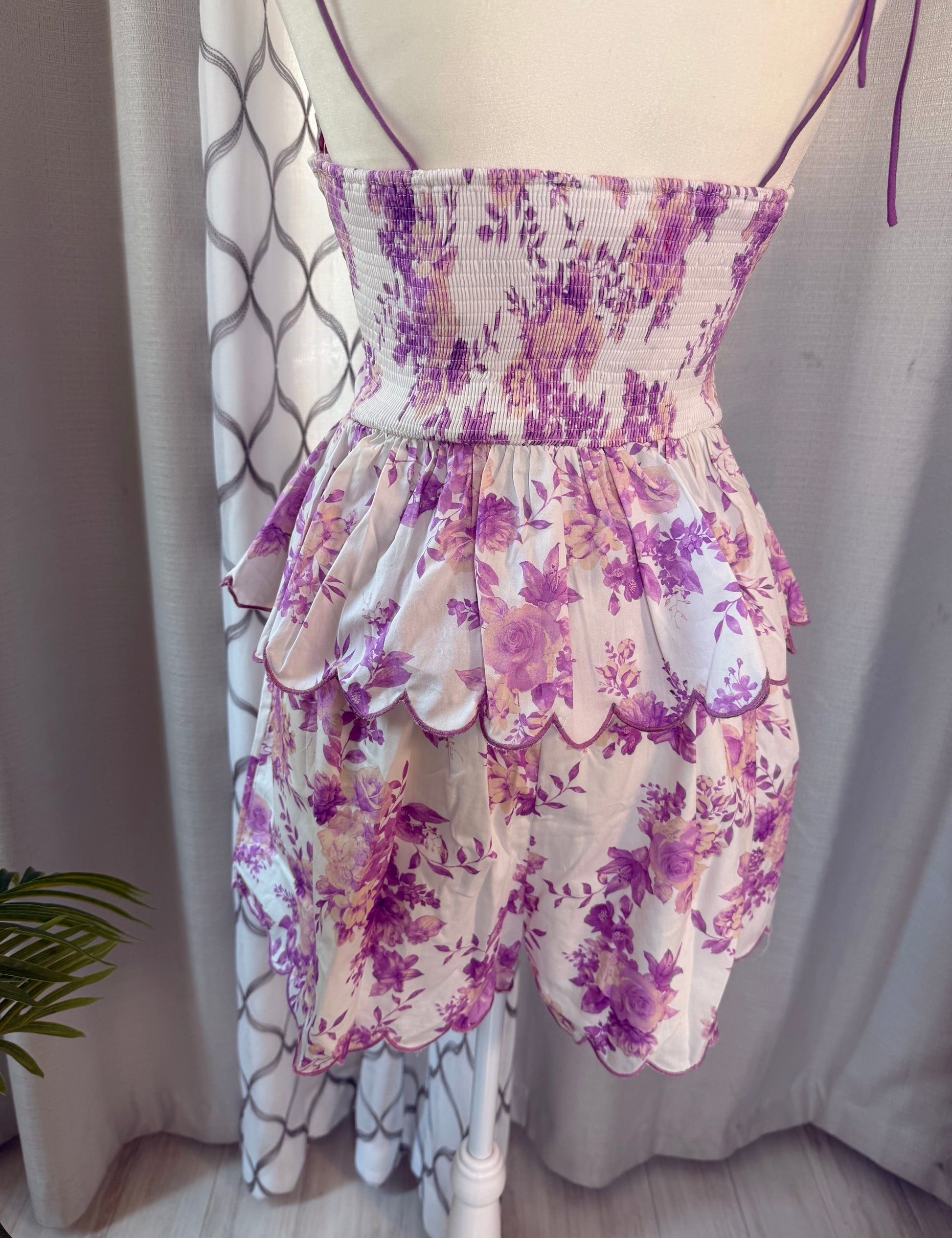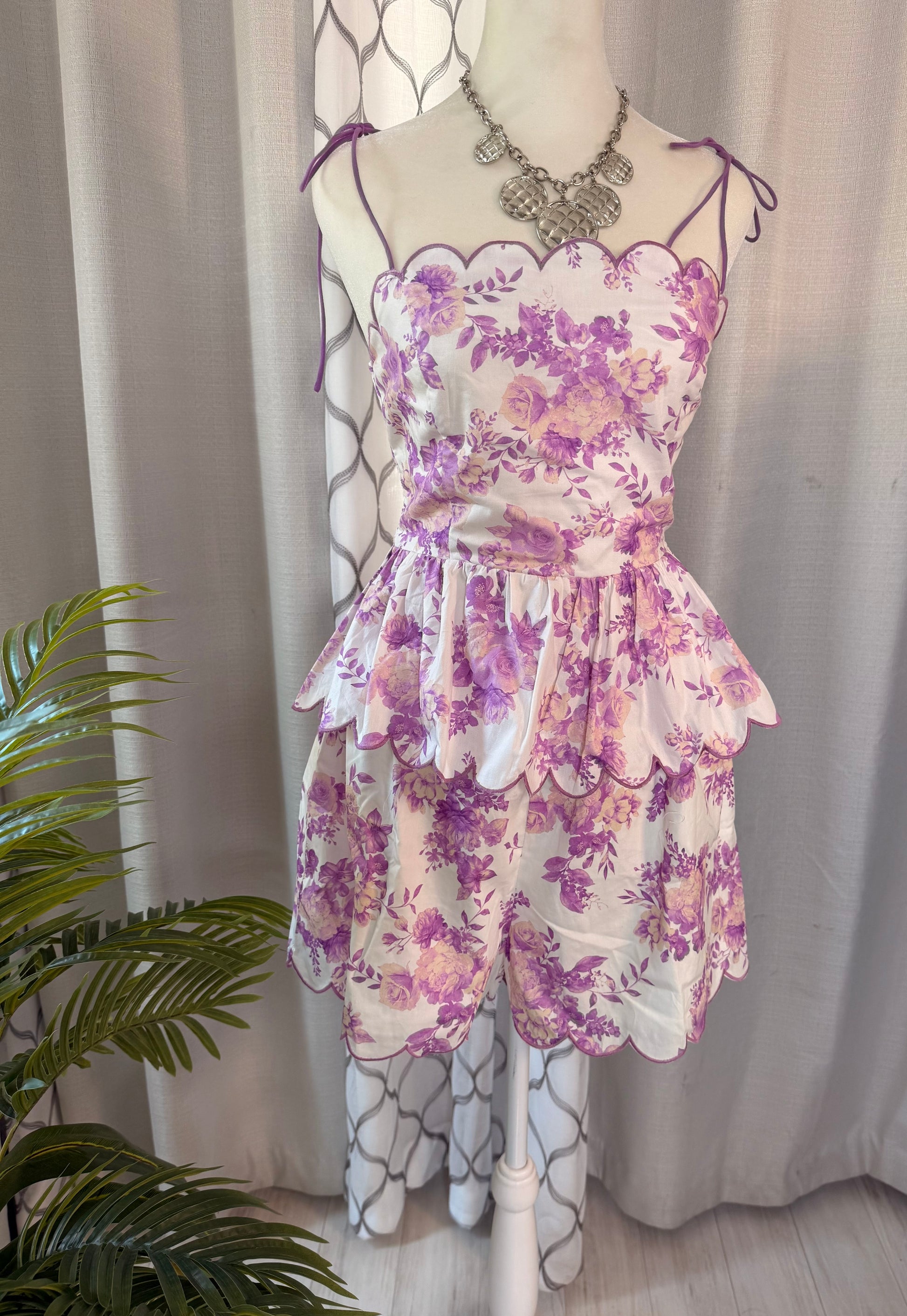 A PRINTED WOVEN TOP AND SHORT SET . TOP FEATURING SCALLOPED STRAIGHT NECKLINE , STRAPS, PEPLUM