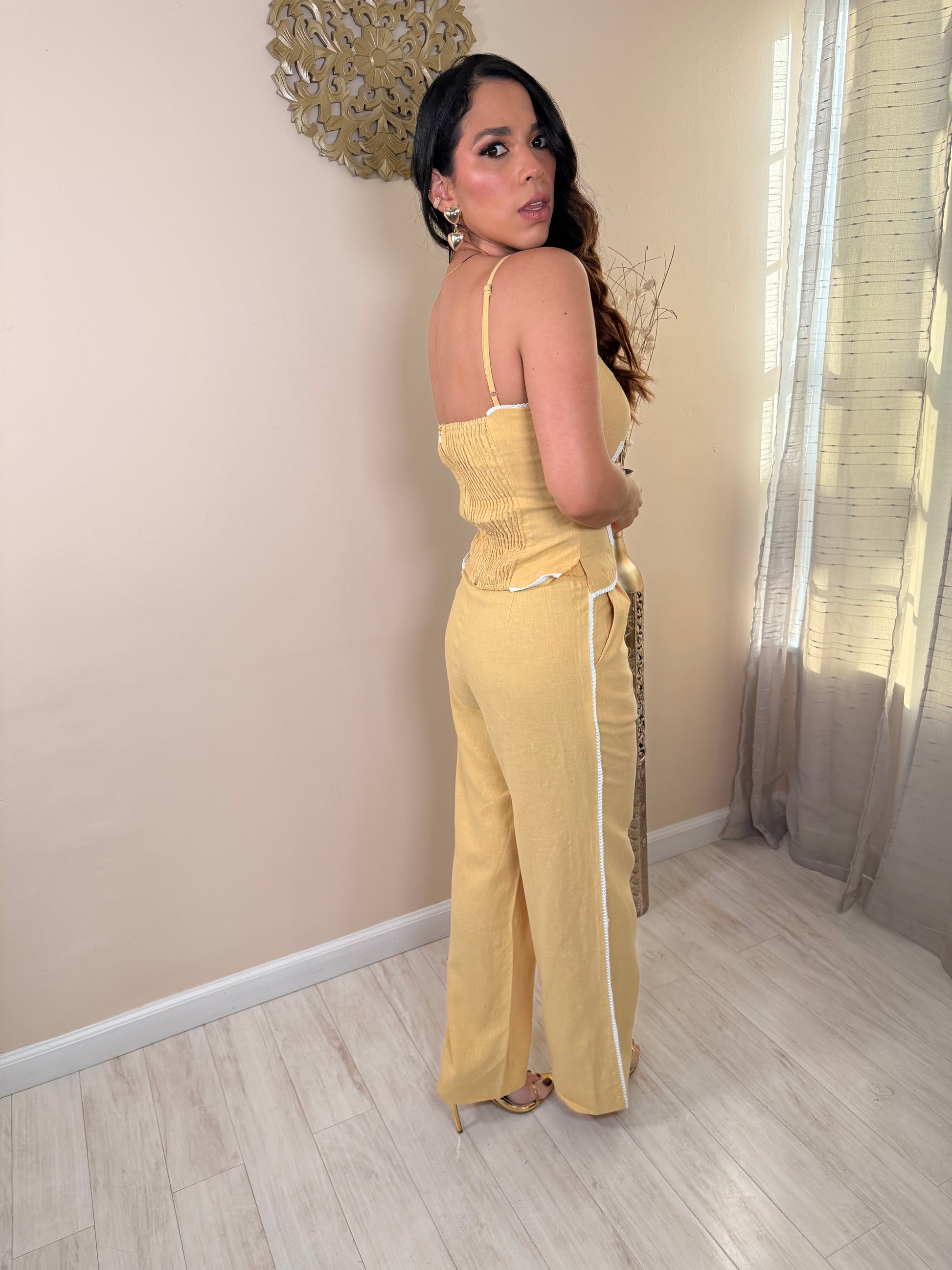 LINEN BLEND LACE DETAIL TANK TOP AND SIDE LACE PANTS SET