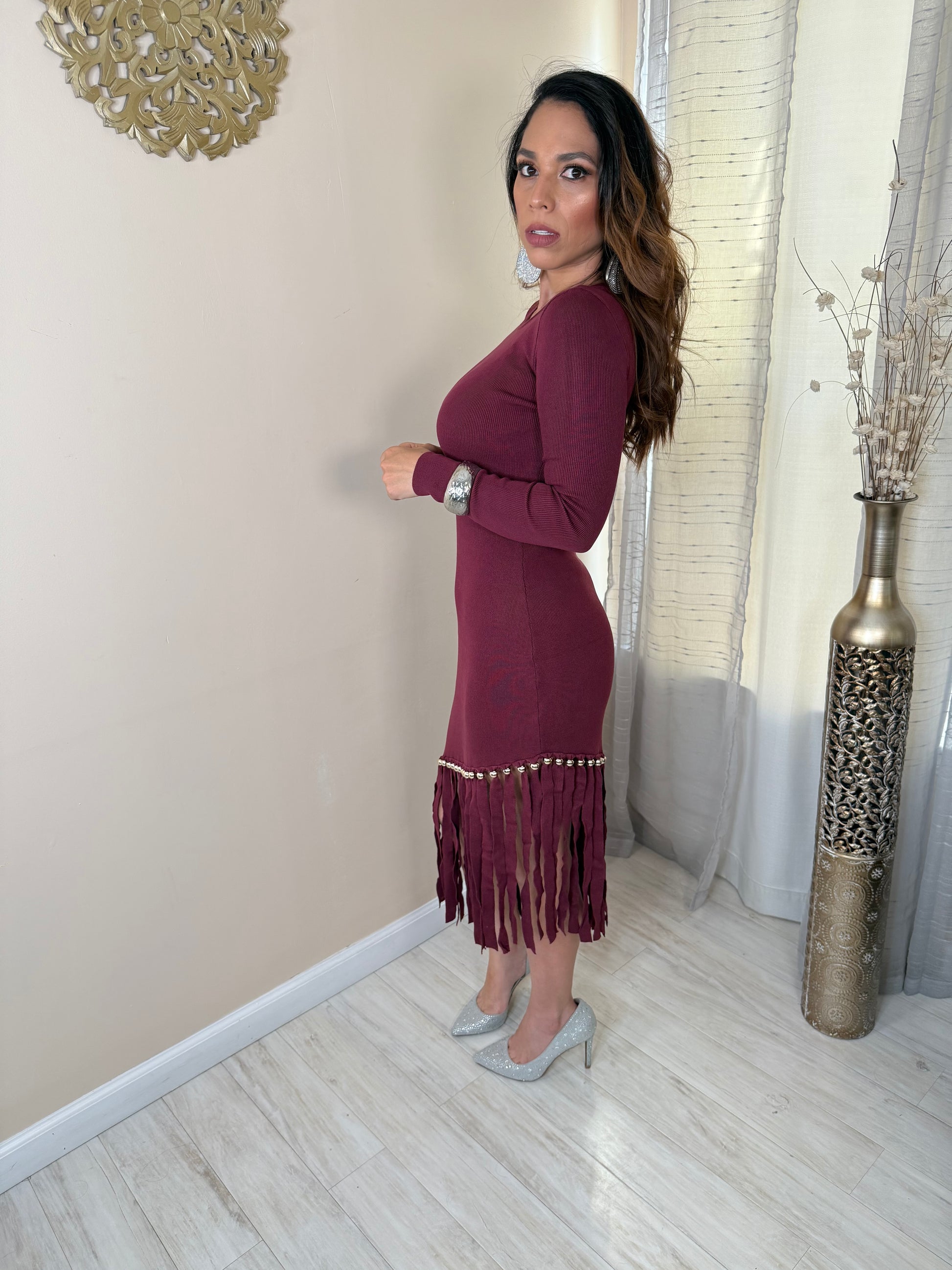 BEADED FRINGE KNIT LONG SLEEVES MIDI DREES